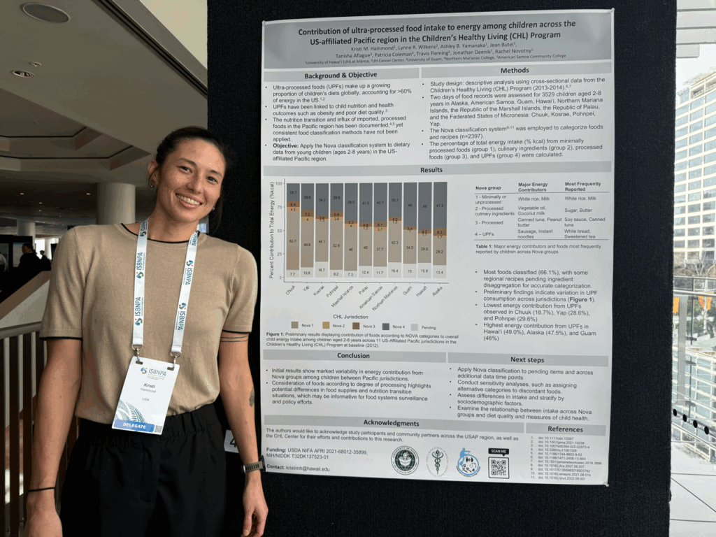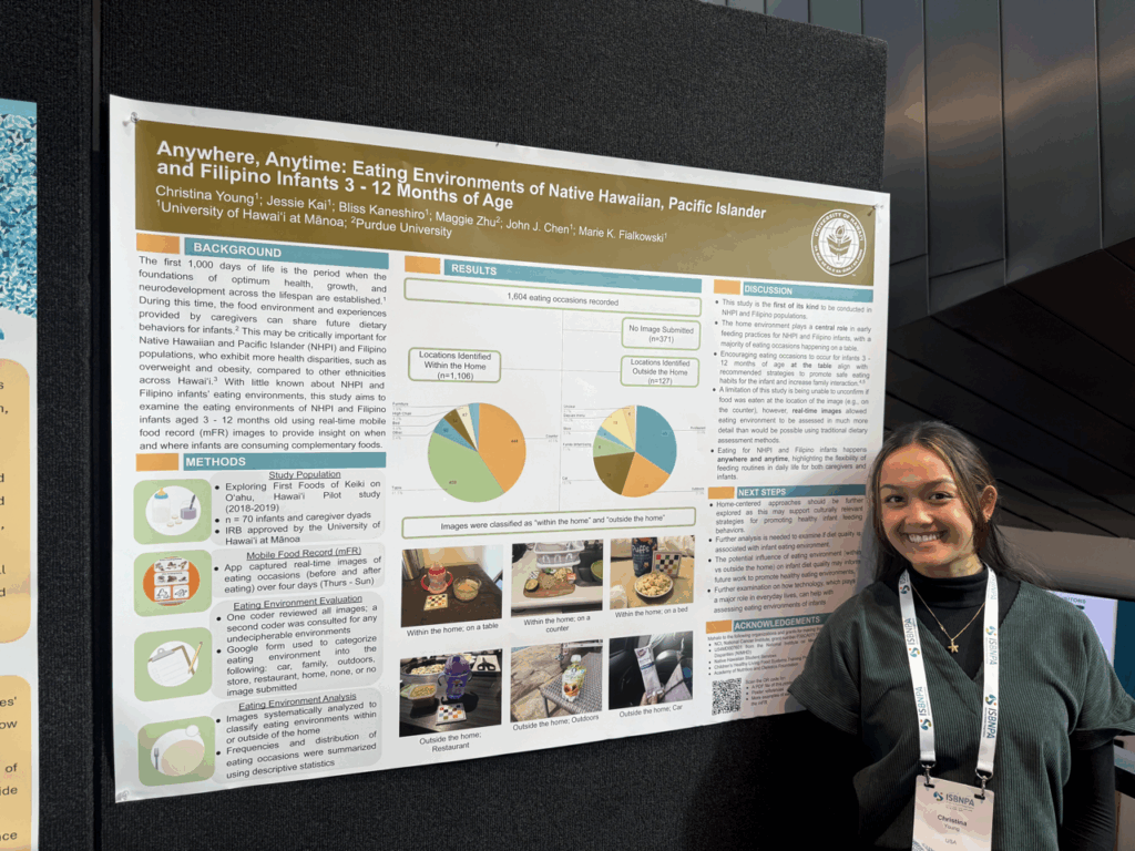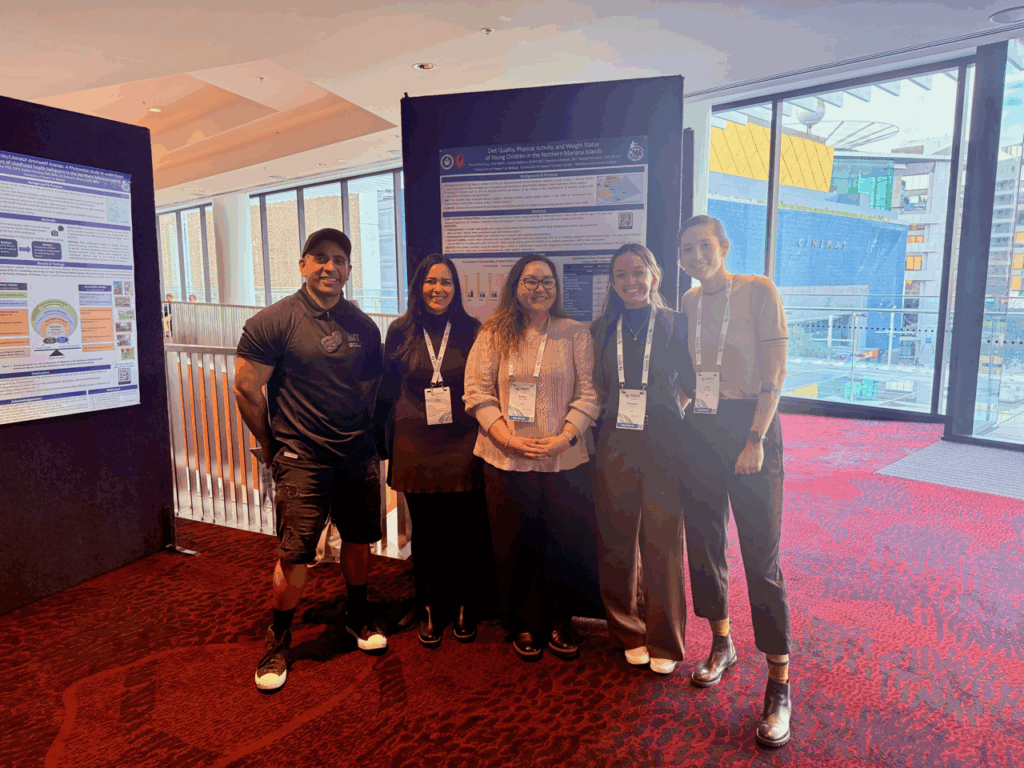 Kristi presented her preliminary research on child dietary intake according to the degree of food processing across the US-Affiliated Pacific Region. Christina shared findings on the eating environments of Native Hawaiian, Pacific Islander, and Filipino infants aged 3–12 months. Ashley presented on diet quality and physical activity in relation to screen time guideline adherence among children in the US-Affiliated Pacific Region. Rica presented on the influence of diet quality and physical activity on childhood overweight and obesity in the Northern Mariana Islands, as well as perceived facilitators and barriers to these health behaviors in the islands.