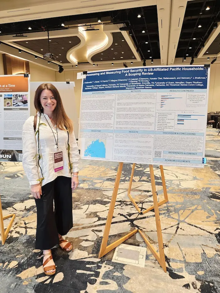 In terms of research and publications, Jennifer also co-authored a paper on Group Model Building Workshops for Children’s Healthy Living in Current Developments in Nutrition (March 2025) and registered a scoping review protocol on an open-access platform on assessing food security in US-Affiliated Pacific Households (June 2024). She has been actively conducting the scoping review and presenting on the research process and preliminary results, including a breakout presentation in Kodiak, Alaska at the Alaska Food Policy Council’s Food Festival and Conference (March 2025) and a poster session in Prior Lake, Minnesota at the Seventh Annual Conference on Native American Nutrition (September 2025). These presentation opportunities have resulted in excellent conversation with professionals from around the nation, including the shift from food security to nutrition security, the future of food security data collection, and the importance of non-retail food in food security, especially in Indigenous and rural populations. She is now working on a manuscript for future publication.